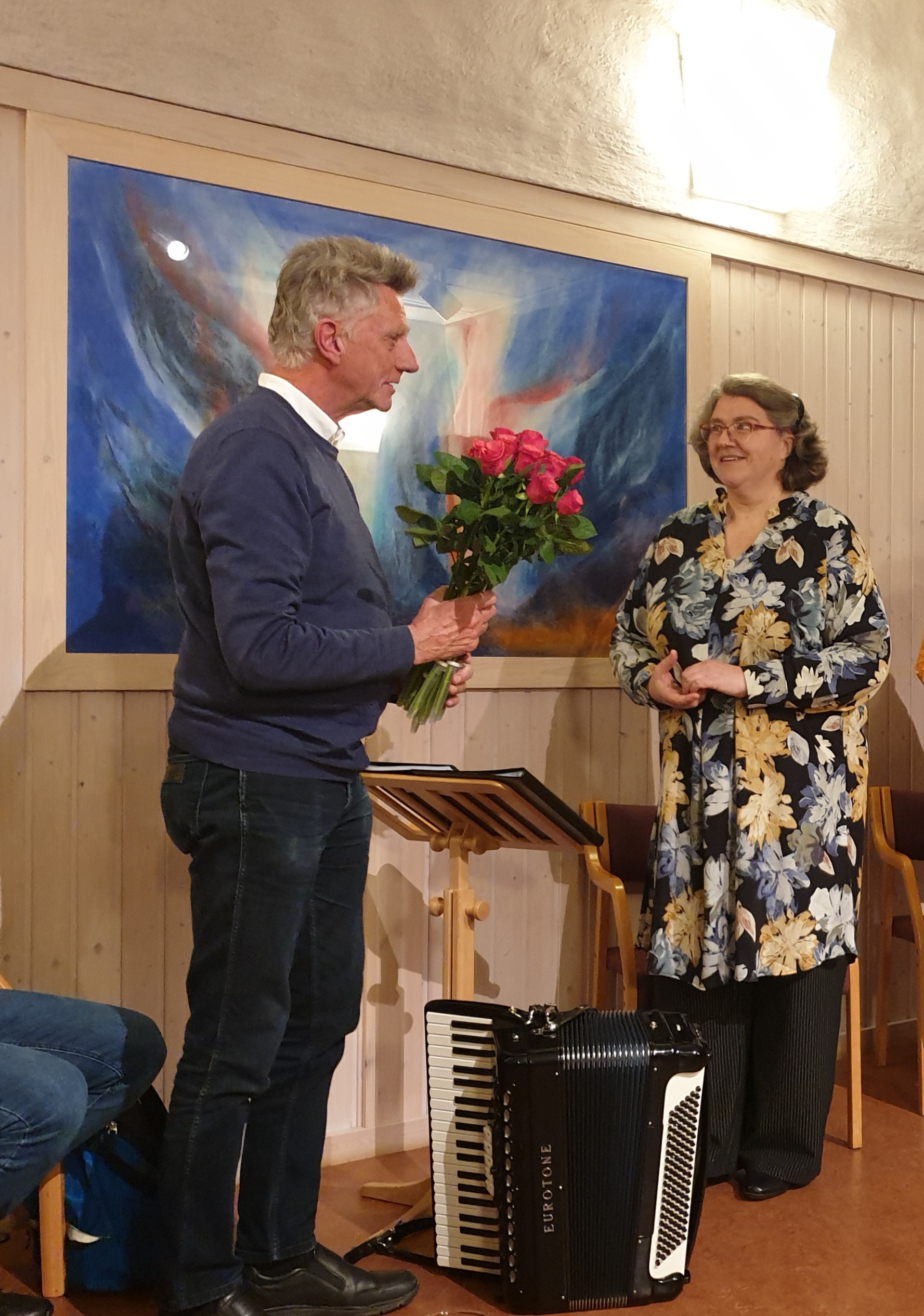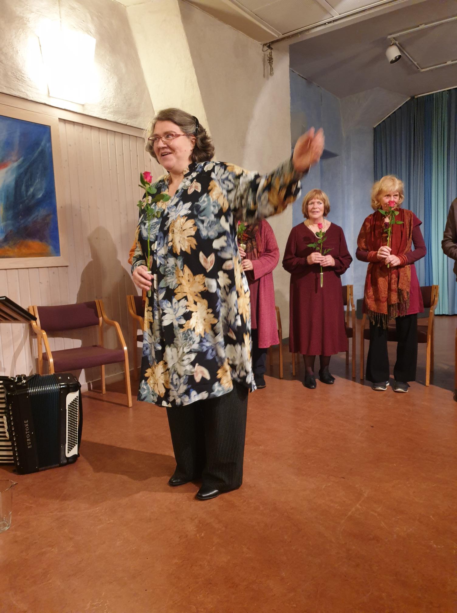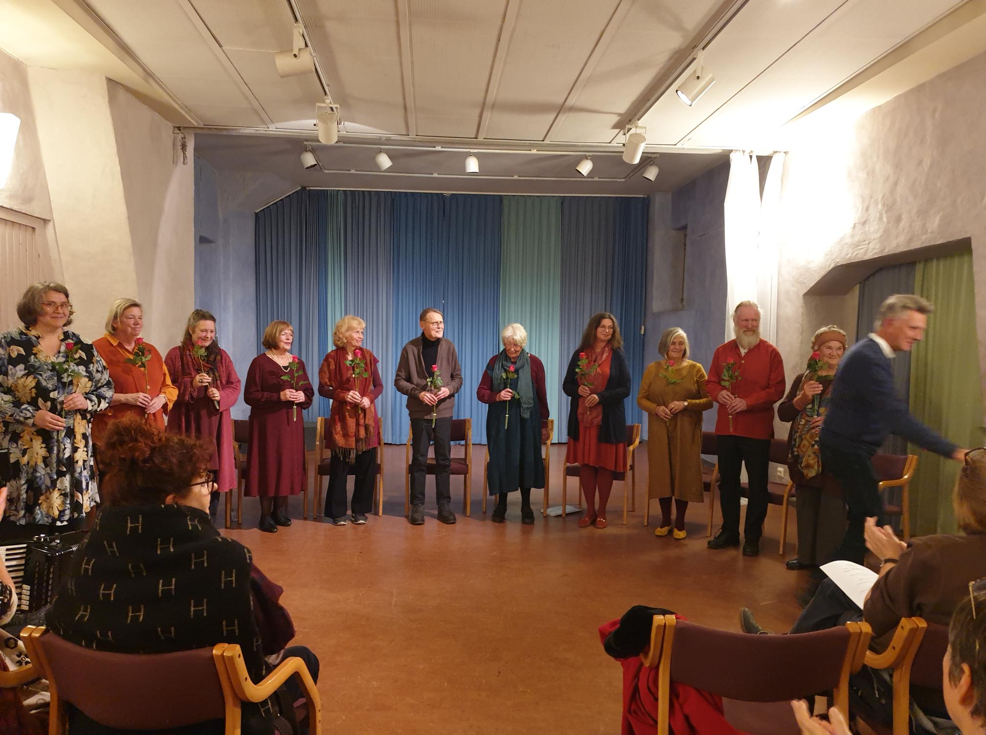 I alle fall så opplevde jeg at det utvidede “Kor i ord”-ensemblet leverte. De var i en fin, levende flyt, og diktene og balladene ble formidlet med stor innlevelse, generøsitet og varme. Det var flyt og det var ild og dramatikk. Og det var vare, poetiske stemninger. Og Bjørg spilte så vakkert på trekkspill, delvis spesialkomponert musikk. Trekkspillet åpnet opp et vart og fint klangrom for diktene. Mellom diktene fikk vi også høre litt fra Meyers biografi.